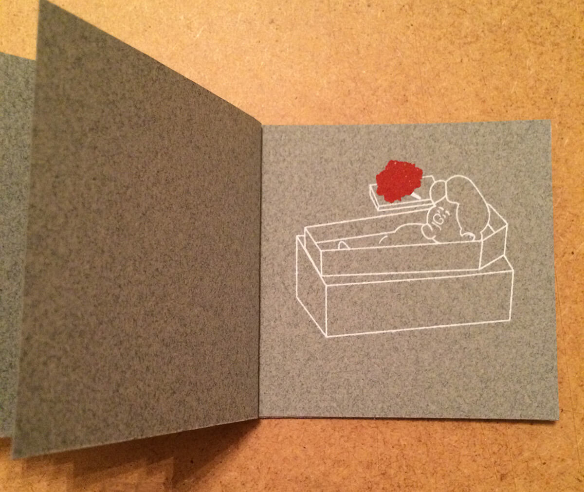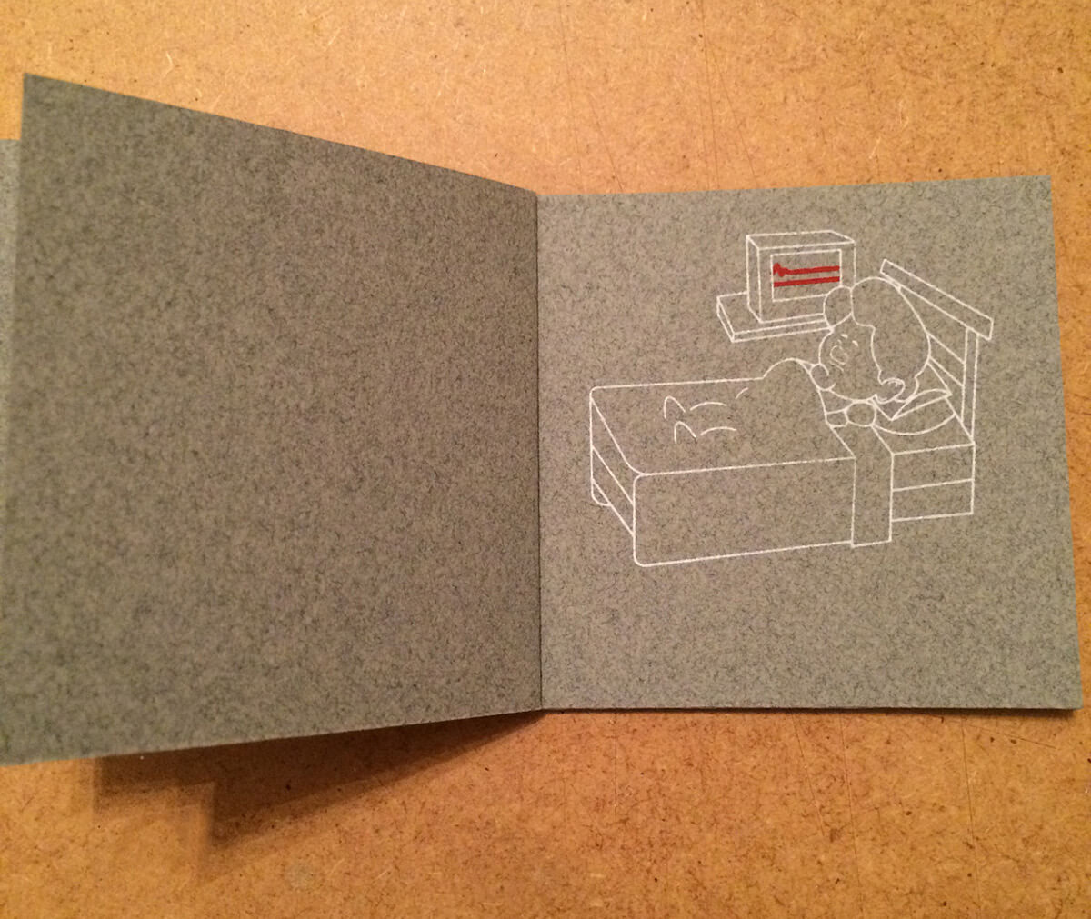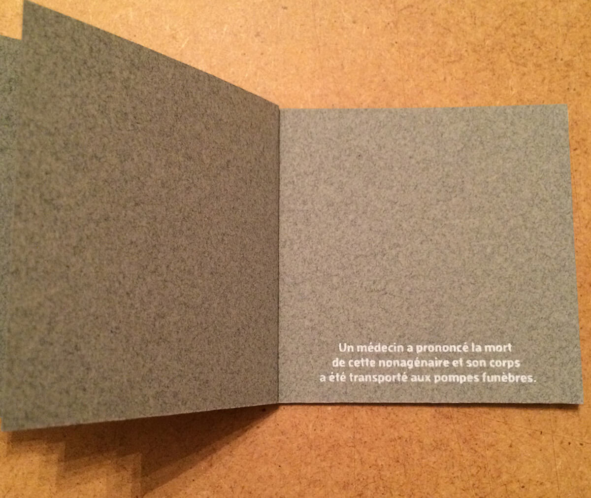 Création d'une mini-édition de livret sur base d'un fait divers réel. Travail entièrement réalisé en sérigraphie sur un format carré avec une reliure fait main.